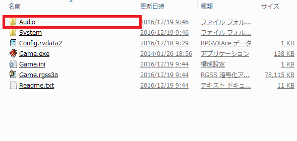 まず、ゲームフォルダの「Audioフォルダ」を開きます